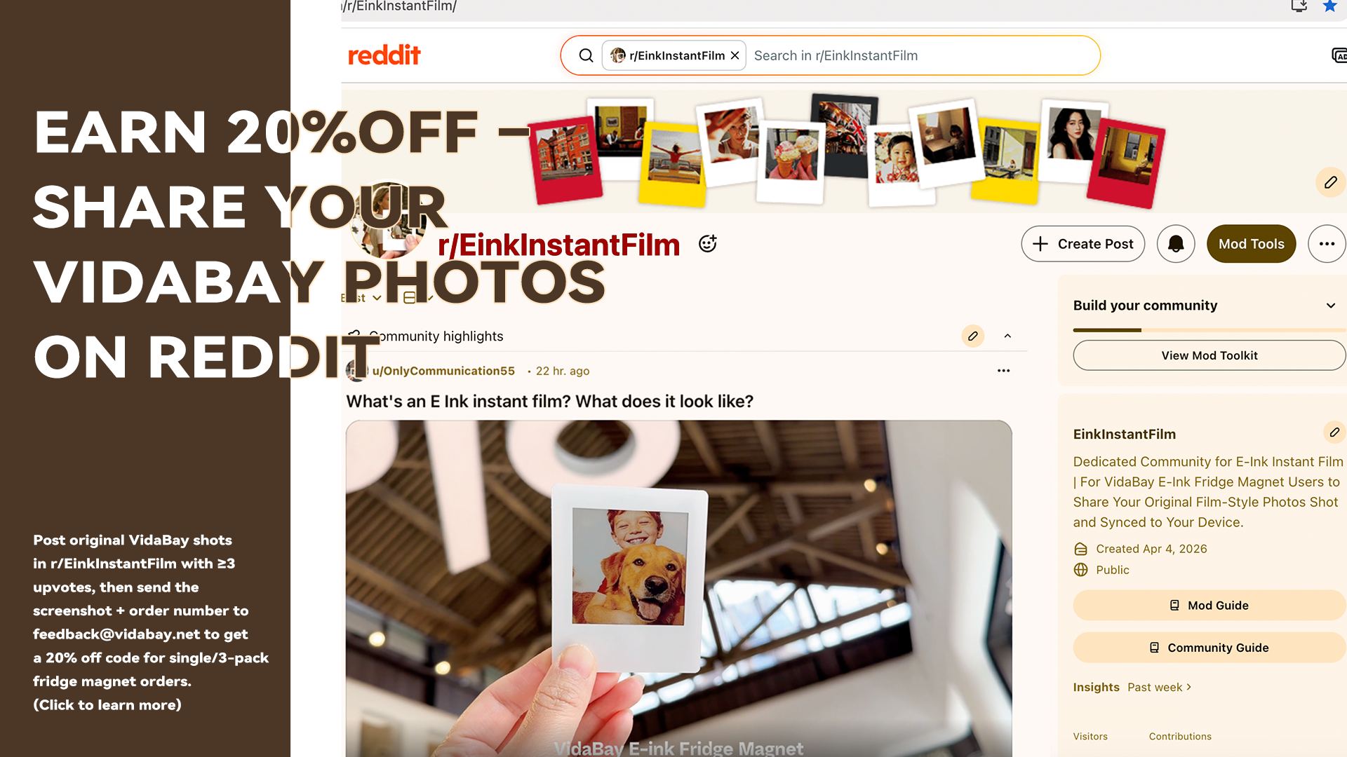 Thank you for your continued support and love for VidaBay. We are honored to have received official recommendation from E Ink Corporation on Facebook, LinkedIn and X, and have been covered by leading media outlets including The Verge, Good eReader, Cool Things, TechBullion, MSN and AP. To give back to our valued users, and to help more precious life moments be seen and shared, we are officially launching our global user campaign: Earn 20% Off: Share Your VidaBay Photos on Reddit. We invite you to post original photos of your VidaBay fridge magnet and unlock an exclusive shopping benefit.