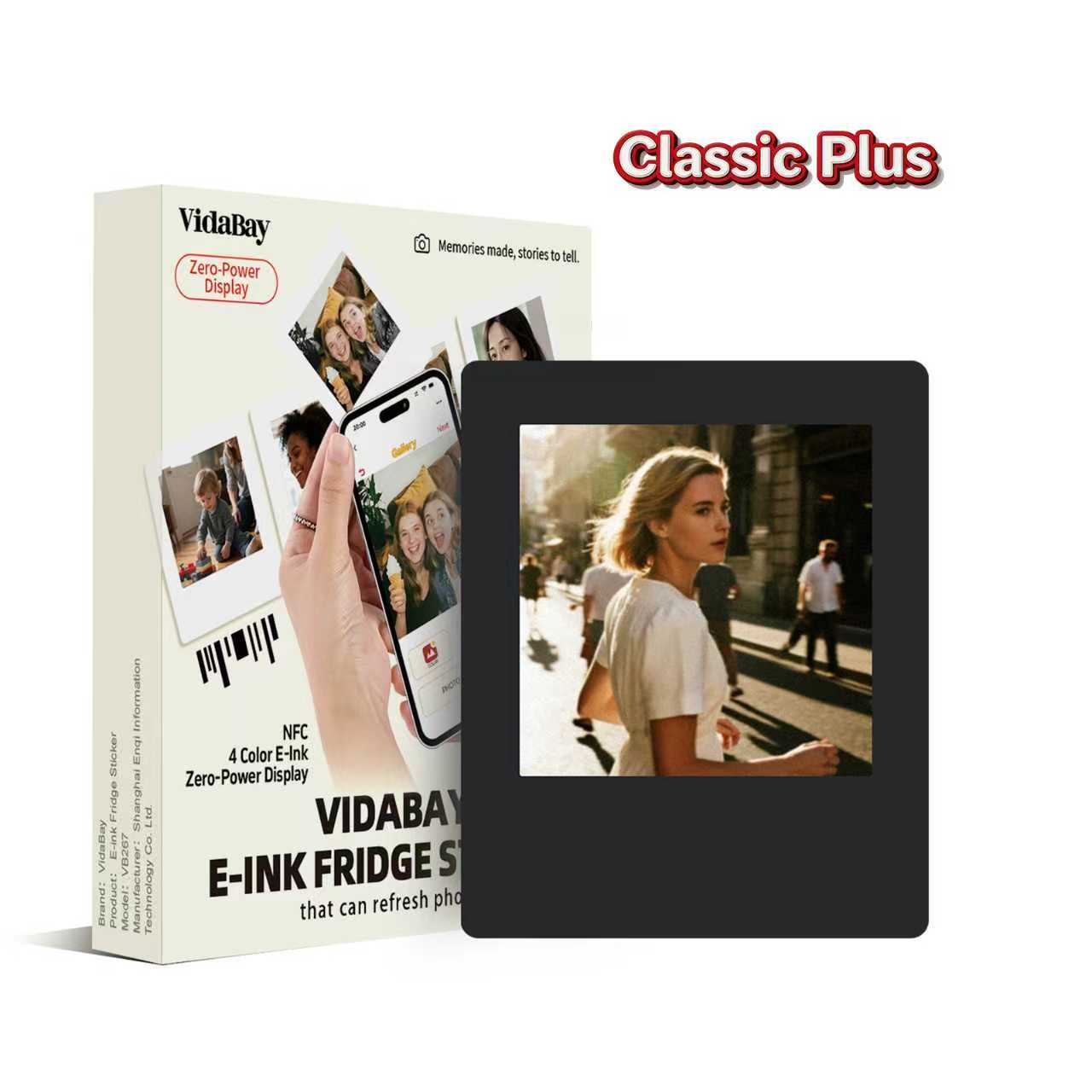 E-Paper fridge magnet fits iPhone & Android (Bluetooth image dock). VidaBay Snap APP offers filters, overlays, 4-color effects for photos. One-tap NFC syncs instantly. Fits leather cases as portable accessory. Battery-free for permanent image display. Strong magnetic back sticks to fridges & whiteboards for decor, notes, memories.