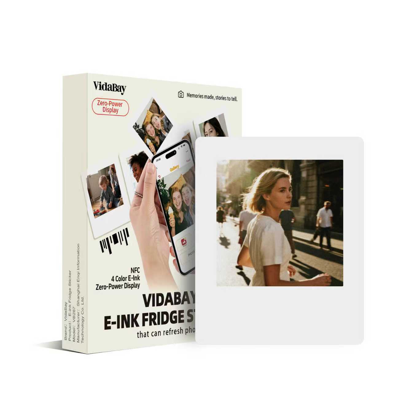4-color E-Paper fridge sticker fits iPhone (Android limited by NFC positions). Pair with VidaBay Snap APP for filters, overlays, B&W effects, 4-color blending to turn photos into personalized visuals. One-tap NFC syncs phone content instantly—no complex setup. Fits leather cases/pouches as portable accessory, or office walls as reminder/to-do board. Custom UV printing with fad-resistant ink; battery-free, retaining images permanently sans electricity. Strong magnetic back secures to fridges/whiteboards for decor, memories, notes.
