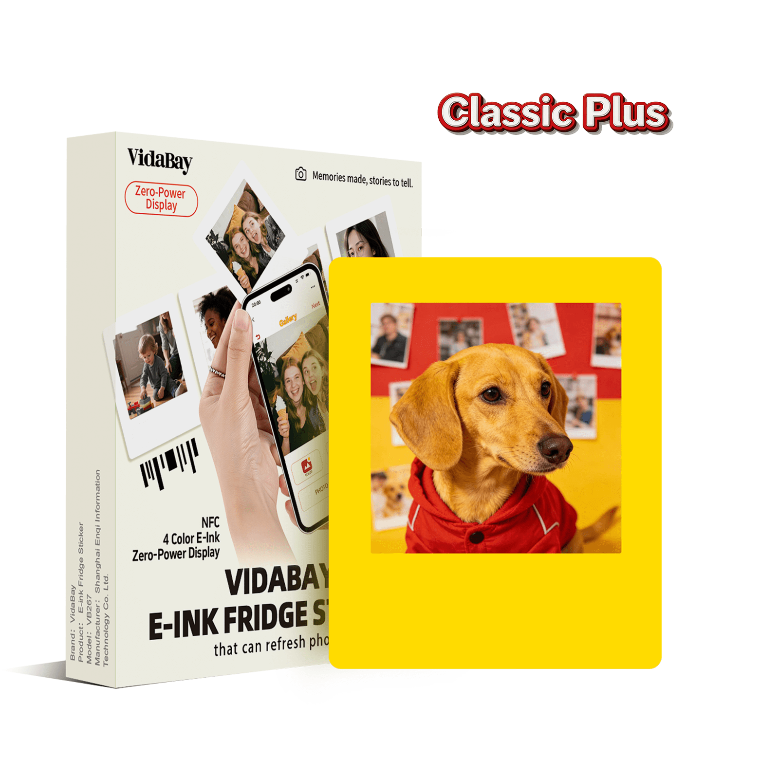 E-Paper fridge magnet fits iPhone & Android (Bluetooth image dock). VidaBay Snap APP offers filters, overlays, 4-color effects for photos. One-tap NFC syncs instantly. Fits leather cases as portable accessory. Battery-free for permanent image display. Strong magnetic back sticks to fridges & whiteboards for decor, notes, memories.